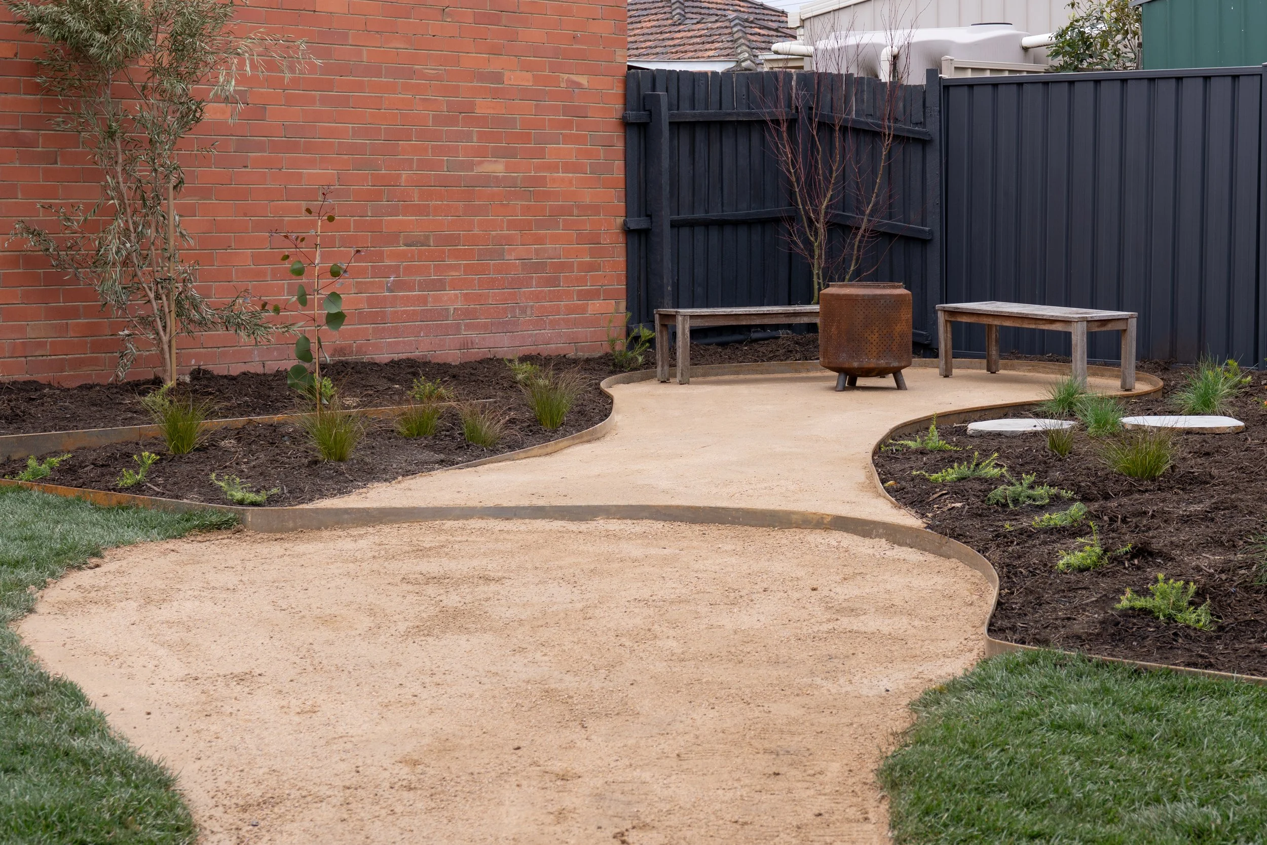 A backyard with a winding sandy pathway bordered by freshly planted garden beds, a brick wall on the left, a black wooden fence on the right, and a seating area with benches and a fire pit.
